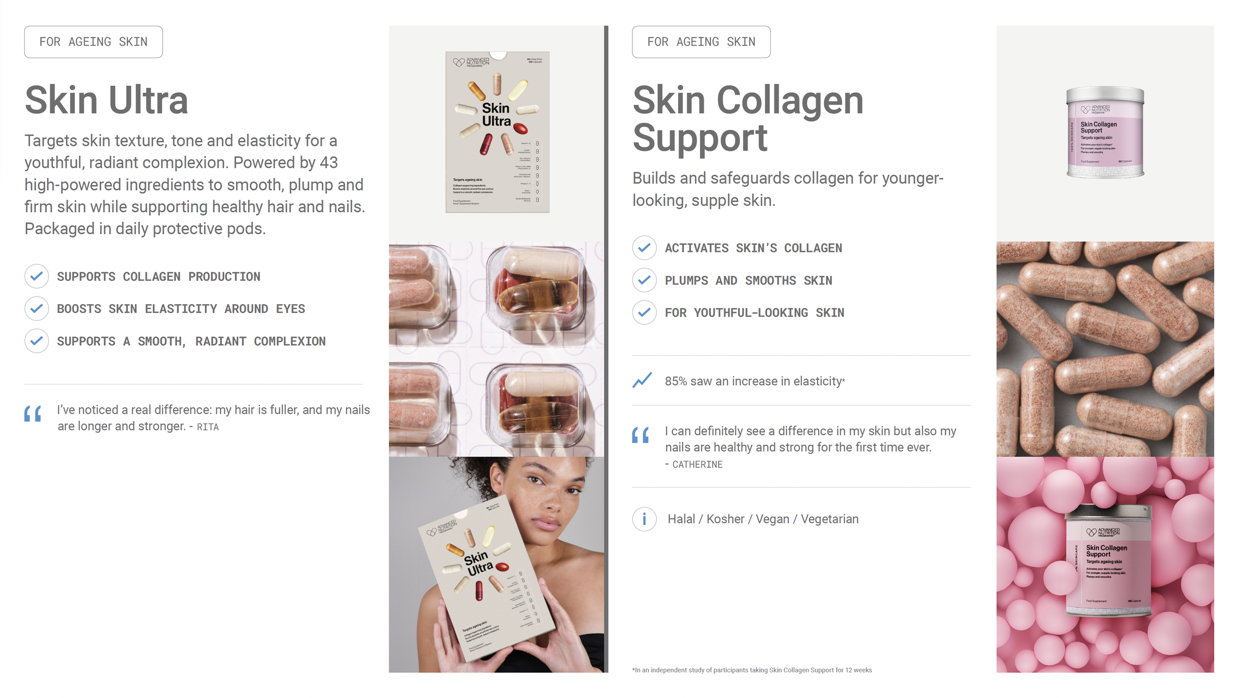 We began by redefining the brand’s positioning — elevating it from a clinical supplement label to a holistic, aspirational wellness brand rooted in scientific credibility. The new logo and design system reflect precision and purity, it feels good for you, while the tone of voice and creative direction introduce the sensoriality of skincare, paired with scientific credibility, and trust.