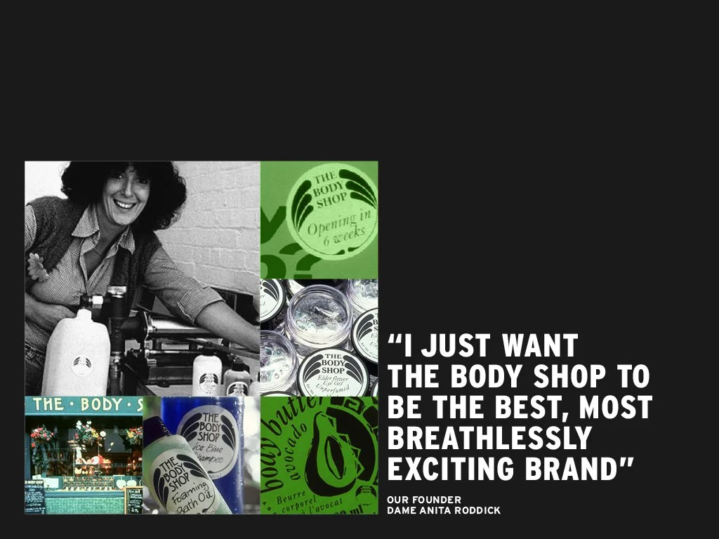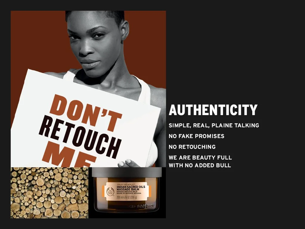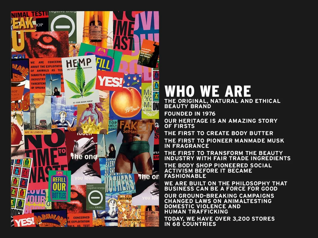 I worked at The Body Shop for many years but my final project was with the new General Manager and the team to evolve and modernise the brand’s purpose, mission, and values—originally defined by founder Anita Roddick in the 1980s—to resonate with today’s global consumer. This work unified heritage-driven activism with contemporary cultural relevance and beauty expectations.